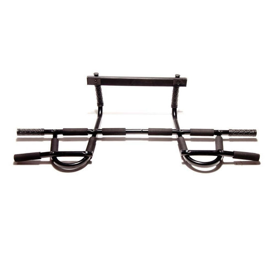 The Iron Body Fitness Door Gym Plus pull up / chin up bar is an ideal multi-functional upper body trainer: pull-ups, sit-ups, push-ups, triceps dips, sculpt & trim your entire body. Multiple foam covered hand grips to target different muscles. It fits most doorways in seconds and is not permanently mounted
