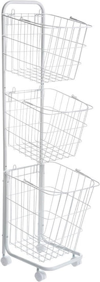 Slim vertical storage tower with 3 deep removable mesh baskets – perfect for organising pantry, laundry, bathroom, toys, vegetables, snacks + retail shelving. Easy mobility and space saving design.