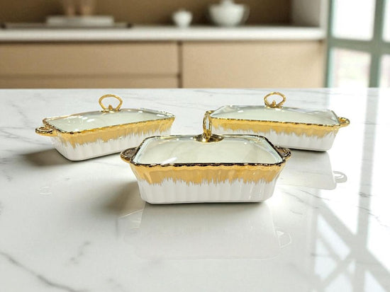 Serve in style with the T3-7DG 3-piece serving dish set, combining elegance and functionality. Featuring a harmonious blend of ceramic, glass, and stainless steel, each dish is designed for both presentation and practicality. The gold and white finish adds a luxurious touch—perfect for formal dining, buffets, or entertaining guests.
