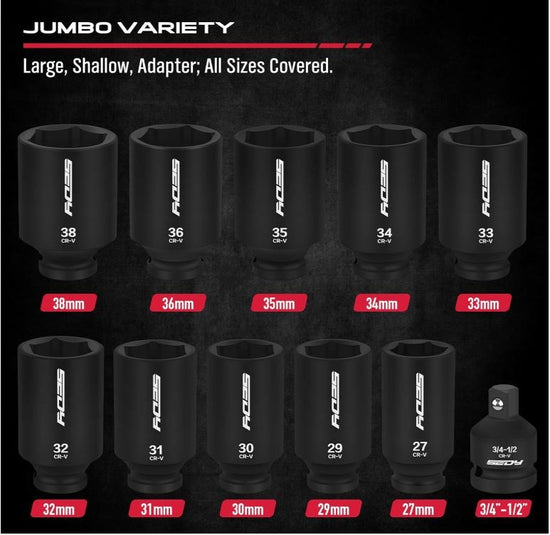 3/4” to 1/2” Adapter: This convenient adapter is included, allowing you to use these sockets with different drive sizes for enhanced versatility.