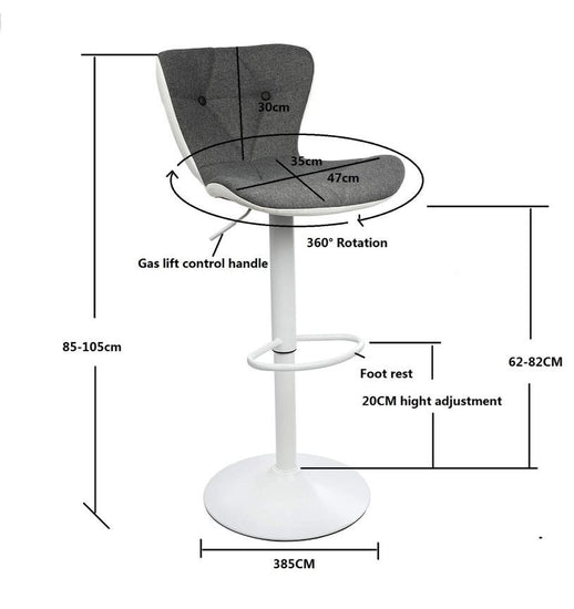Functionality is key: the stool features a smooth, Class 2 gas lift mechanism allowing for effortless height adjustment, perfectly transitioning between counter and bar height. The 360-degree swivel allows for easy interaction, while the sturdy, wide 385mm white base includes a safe slip grip to maintain stability and protect your floors.