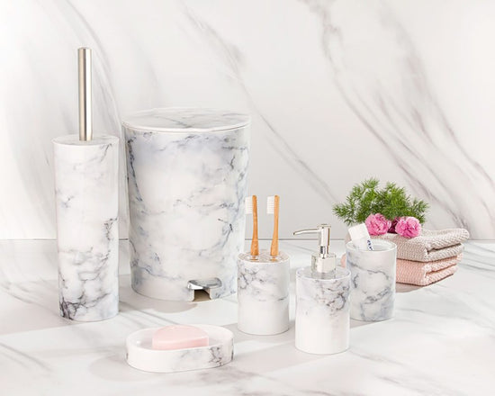 Introducing our Bathroom Set 6pc in Beige, a must-have for any modern bathroom. This stylish and functional set includes essential items designed to elevate your daily routine while enhancing your bathroom decor. The set features a toothbrush cup for convenient storage, a toothpaste cup, a soap dish, a tissue rack, a toilet brush holder, a liquid holder, and a dustbin. Each piece is crafted with high-quality materials to ensure durability and ease of use, providing both practicality and elegance to your bathroom space.