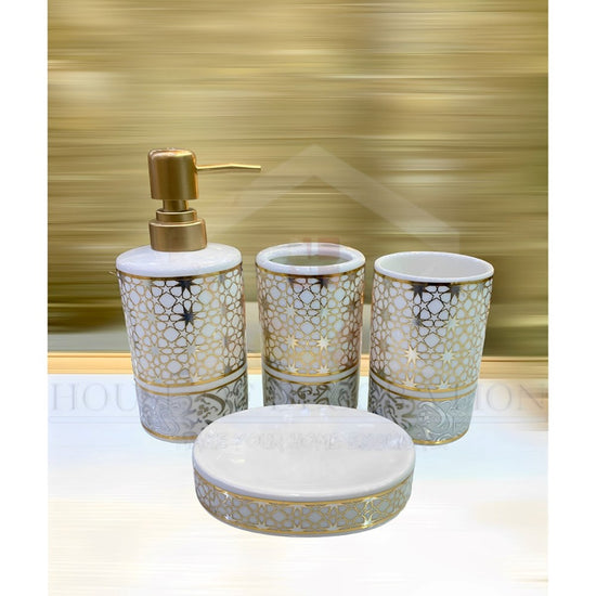 Bathroom Accessories 4pc HT8235 – Elegant Gold & White with Arabic Design