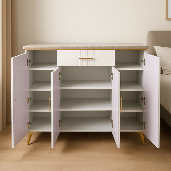Enhance the elegance and functionality of your living space with the Cabinet 4 Door & 1 Drawer 618. This stylish piece offers ample storage space while complementing any room decor with its sophisticated white and gold finish. The four doors provide easy access to your belongings, and the additional drawer offers extra storage for smaller items. Ideal for organizing your home or office, this cabinet combines practicality with a chic aesthetic.
