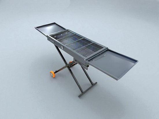 A compact, travel-ready BBQ built for easy setup and pack-down. This rectangular charcoal grill sits on a sturdy X-frame folding stand with tilt-and-roll wheels, so you can move it like a trolley. The split lid secures with a center latch for transport, while side ventilation holes help manage airflow and heat. A chrome carry handle makes lifting simple, and the powder-coated steel body is made for outdoor use.