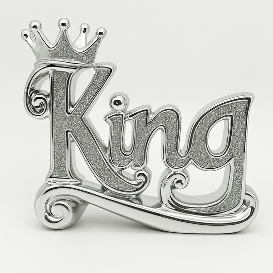 Introducing the Crystal King Decor, a stunning silver king sign adorned with a regal crown on top. This exquisite piece is perfect for adding a touch of elegance and sophistication to any space.