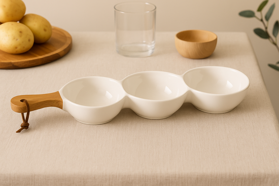 Elevate your dining experience with the Dish Plate BWT30-03 — a stylish fusion of functionality and design. Crafted from durable porcelain and accented with a natural acacia wood handle, this plate brings both charm and practicality to your table. Its triple-compartment structure is perfect for serving appetizers, dips, snacks, or tasting platters, making it a versatile choice for any occasion.