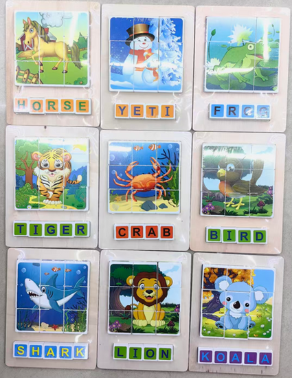 A fun early-learning animal puzzle matching set designed to help children learn spelling, word recognition, colour recognition & problem solving — all while they play!