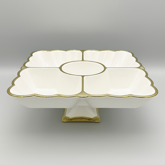Elevate your serving experience with this elegant Dry Fruit Stand YH066, designed with sophistication and functionality in mind. Crafted from high-quality porcelain, this 5-compartment stand features a gold and white finish that brings a luxurious touch to your table setting. The square pedestal base ensures stability while the segmented design makes it perfect for serving a variety of nuts, dried fruits, or sweets in an organized and stylish manner.