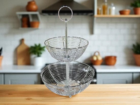 Display and store your fresh produce in style with this 2 Tier Stainless Steel Fruit Basket. The sleek silver design offers ample space for fruits, vegetables, or snacks, while the vertical stacking saves counter space. Perfect for kitchens, dining tables, or events, it combines functionality with a modern aesthetic.