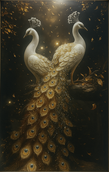 Showcasing a breathtaking pair of white peacocks with stunning golden tails, this artwork exudes grace and grandeur. Lavishly detailed with shimmering crystals and diamond-style accents, the piece sparkles with elegance and depth. Framed and ready to hang, it’s the perfect centerpiece for any refined interior.