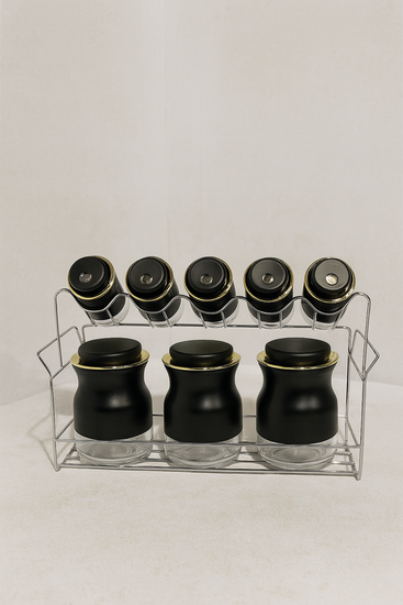 Spice Condiment Jars & Rack Stand 8pc Black & Gold O1016HJ