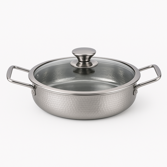This 30cm stainless steel fry pan with a tempered glass lid is built for performance and durability. Ideal for everyday cooking, it features a polished stainless steel body that ensures even heat distribution, while the transparent lid allows you to monitor cooking without losing heat or moisture.