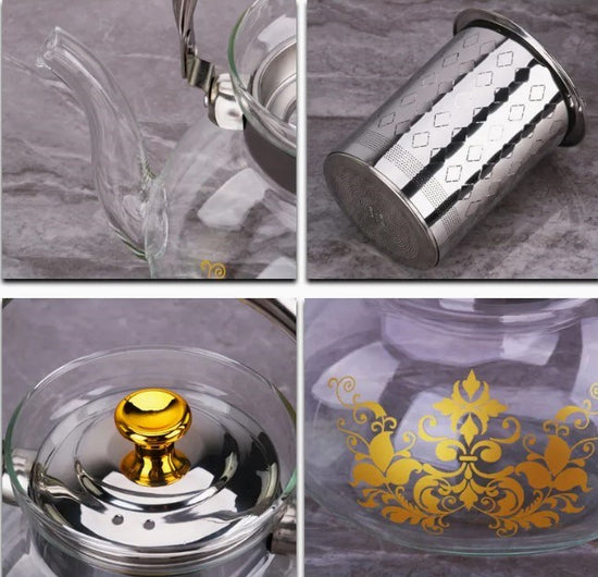 Elevate your tea time with the Tea Pot 1.6L YS19022-246, a beautifully crafted piece that combines the elegance of stainless steel with the clarity of glass. Designed in a striking silver and gold color combination, this teapot brings both style and practicality to your tea service, whether you're hosting a formal gathering or enjoying a relaxing cup at home.