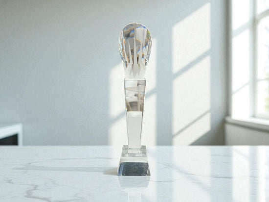 This elegant trophy plaque features a tall, refined structure crafted from premium rock crystal. Its brilliant clarity and weighty feel make it ideal for commemorating achievements, milestones, or special recognition events.