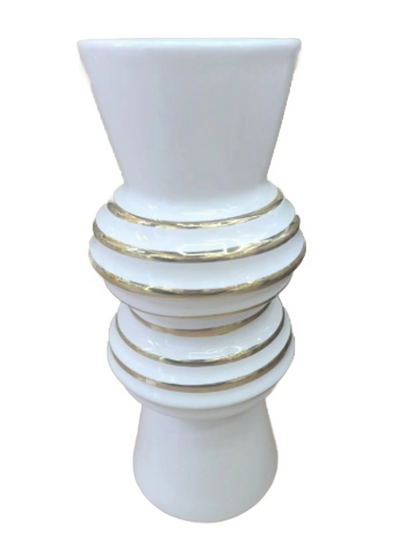 Introducing our elegant White and Gold Vase, a stunning addition to any home decor. Crafted with precision, this vase showcases a sleek white ceramic body adorned with intricate gold detailing. Its timeless design effortlessly blends modern and classic aesthetics, making it a versatile piece for various interior styles.