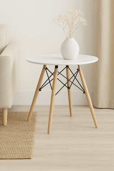 Add a fresh touch to your space with this small round coffee table, featuring a clean white tabletop and natural wooden legs with black metal cross-bracing. Its compact size and minimalist design make it ideal for modern interiors where space and style matter.