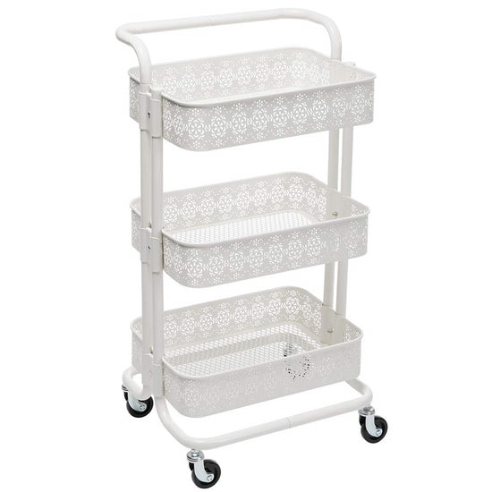 Enhance your home or workspace with this beautifully crafted white trolley featuring a delicate flower design. With a strong steel frame and multi-tiered shelving, it's ideal for organizing kitchen essentials, bathroom items, or crafting supplies.